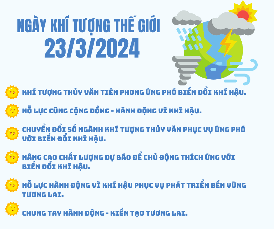 Với Ngày Khí tượng thế giới năm 2024, Tổ chức Khí tượng thế giới (WMO) khẳng định, những nỗ lực dự báo, cảnh báo sớm và chủ động hành động vì khí hậu là vấn đề toàn cầu nhằm tăng cường khả năng phục hồi và ứng phó rủi ro thiên tai, đẩy mạnh giảm phát thải khí nhà kính góp phần giải quyết khủng hoảng khí hậu. Việc tiếp tục tăng cường năng lực, nhận thức của đội ngũ cán bộ các cấp, tuyên truyền nâng cao hiểu biết cho cộng đồng nhằm chủ động các biện pháp phòng ngừa, ứng phó, giảm nhẹ rủi ro thiên tai, thích ứng với biến đổi khí hậu.