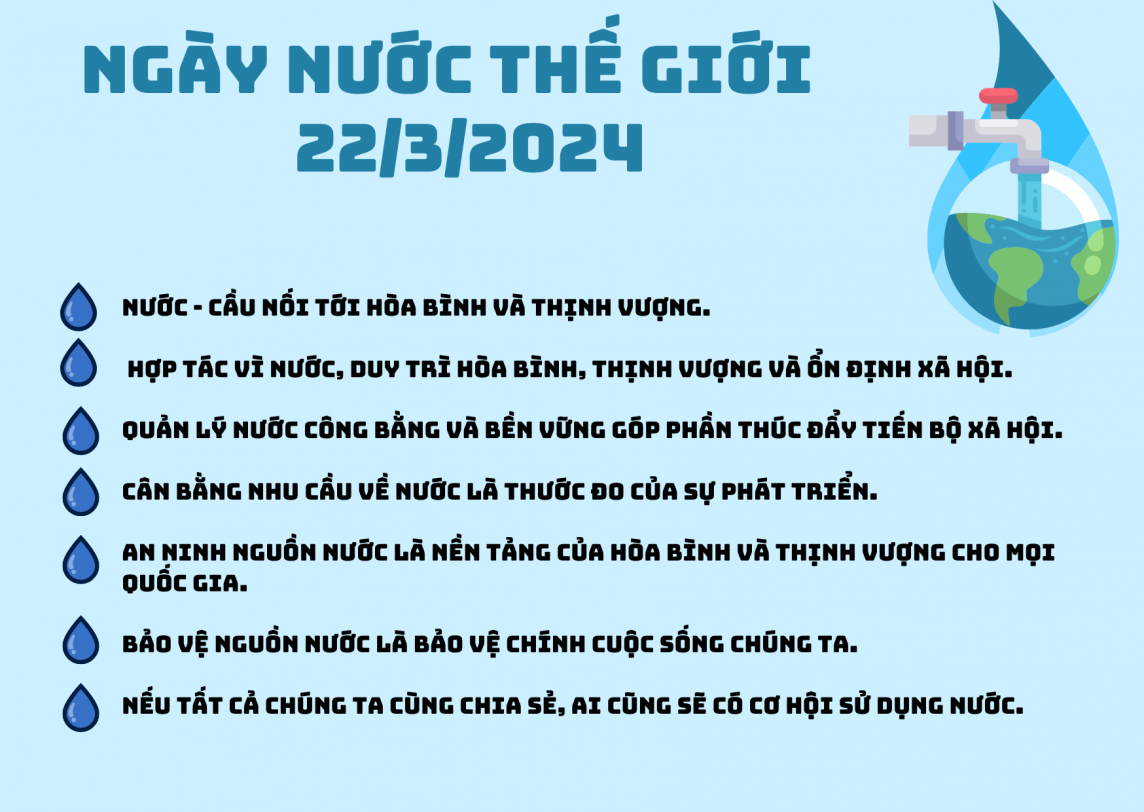 Theo Văn phòng UNDP tại Việt Nam, chủ đề của Ngày Nước thế giới năm 2024 tập trung vào vai trò quan trọng của tài nguyên nước đối với sự ổn định và thịnh vượng của thế giới. Qua đây, Liên hợp quốc cảnh báo, khi nguồn nước bị khan hiếm hoặc ô nhiễm, khi mọi người không có khả năng tiếp cận nước an toàn hoặc không được tiếp cận nước một cách bình đẳng, căng thẳng có thể gia tăng giữa những cộng đồng và các quốc gia.