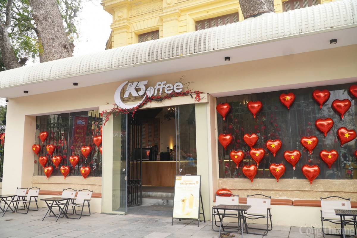 | Quán cafe K5 trang trí những quả bóng có hình cờ đỏ, sao vàng. |