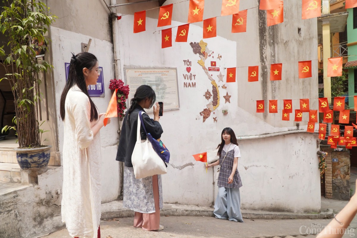 | Bạn Trần Khánh Huyền đang chụp ảnh với những lá cờ tại con ngõ nhỏ trên phố Yên Phụ. |