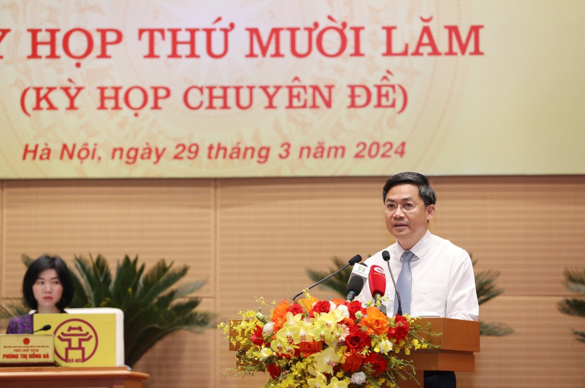 | Phó Chủ tịch UBND thành phố Hà Nội Hà Minh Hải trình bày tờ trình tại kỳ họp (Ảnh: Linh Phạm) |