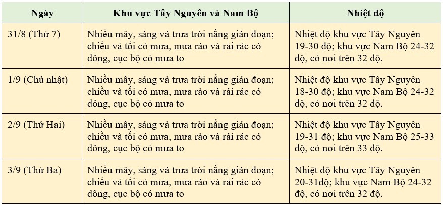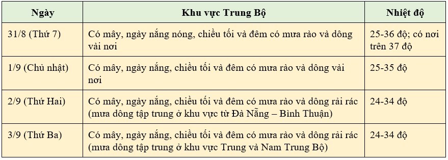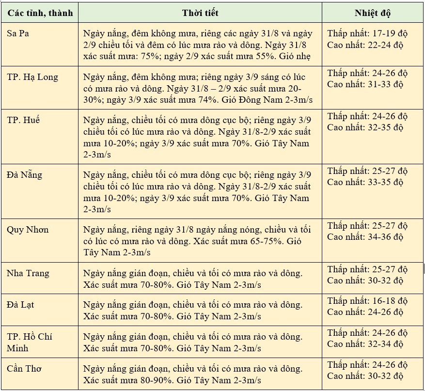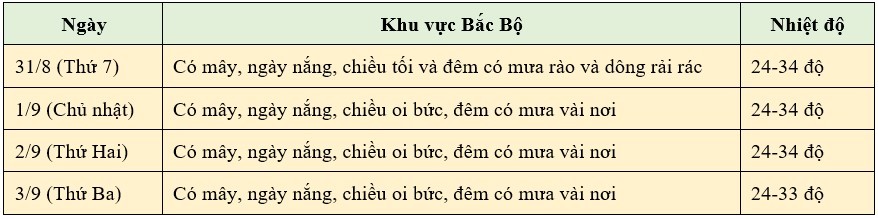 Theo Trung tâm Dự báo khí tượng thủy văn quốc gia, thời tiết 4 ngày Quốc khánh 2/9 trên cả nước từ ngày 31/8 đến 3/9 như sau: