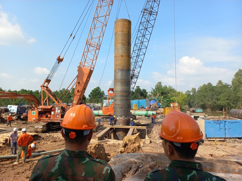 Lực lượng cứu hộ đã tiến hành gia công hệ khung đỡ và hàn nối 2 đoạn ống vách đường kính 2,1m, mỗi đoạn ống dài 12m.