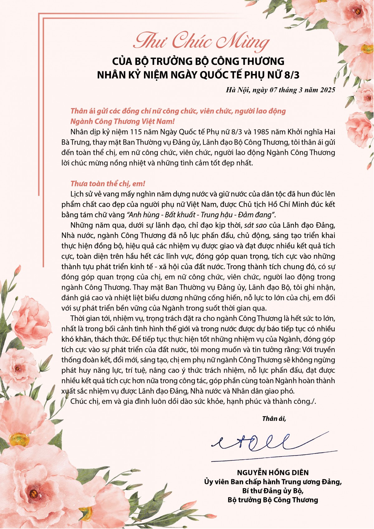 Nhân dịp kỷ niệm 115 năm Ngày Quốc tế Phụ nữ 8/3 và 1985 năm Khởi nghĩa Hai Bà Trưng, thay mặt Ban Cán sự Đảng, Lãnh đạo Bộ Công Thương, Bộ trưởng Nguyễn Hồng Diên đã gửi đến toàn thể chị, em nữ công chức, viên chức, người lao động ngành Công Thương lời chúc mừng nồng nhiệt và những tình cảm tốt đẹp nhất.