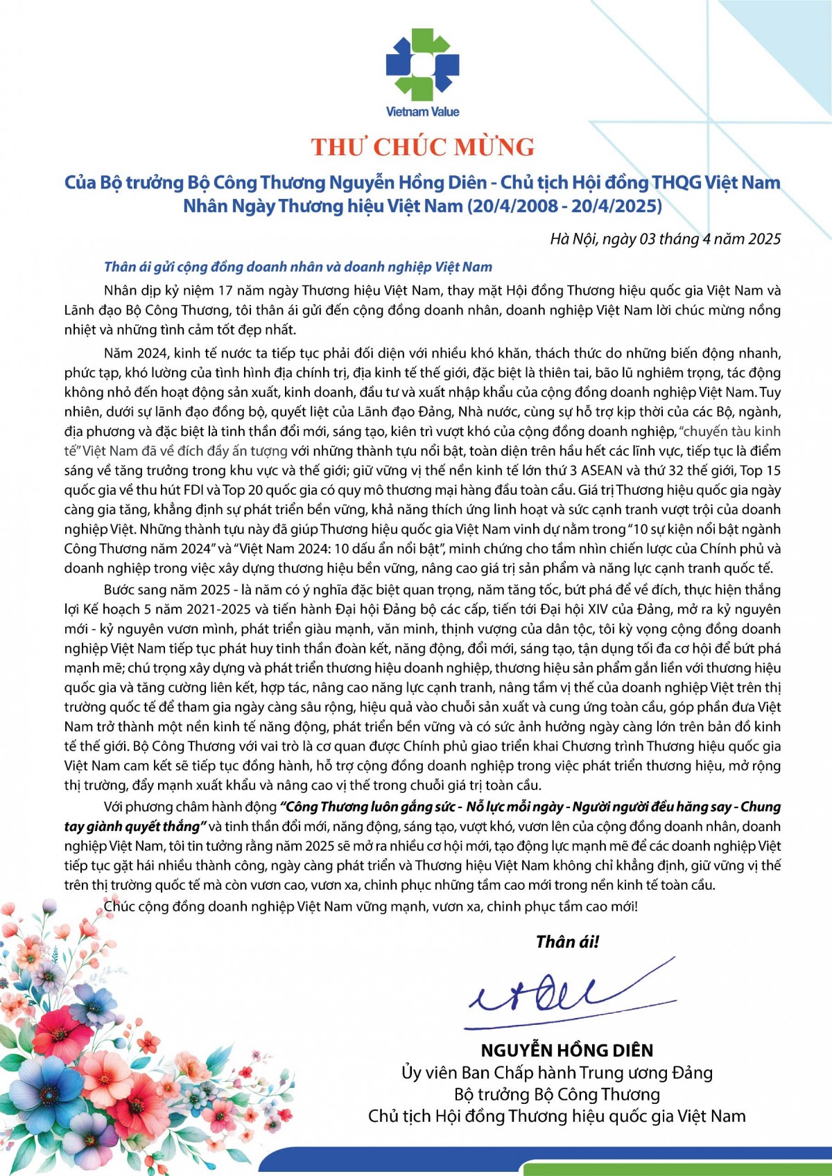 Nhân dịp kỷ niệm 17 năm Ngày Thương hiệu Việt Nam (20/4/2008 - 20/4/2025), thay mặt Hội đồng Thương hiệu quốc gia Việt Nam và Lãnh đạo Bộ Công Thương, Bộ trưởng Bộ Công Thương Nguyễn Hồng Diên - Chủ tịch Hội đồng Thương hiệu quốc gia Việt Nam thân ái gửi đến cộng đồng doanh nhân và doanh nghiệp Việt Nam lời chúc mừng nồng nhiệt và những tình cảm tốt đẹp nhất.