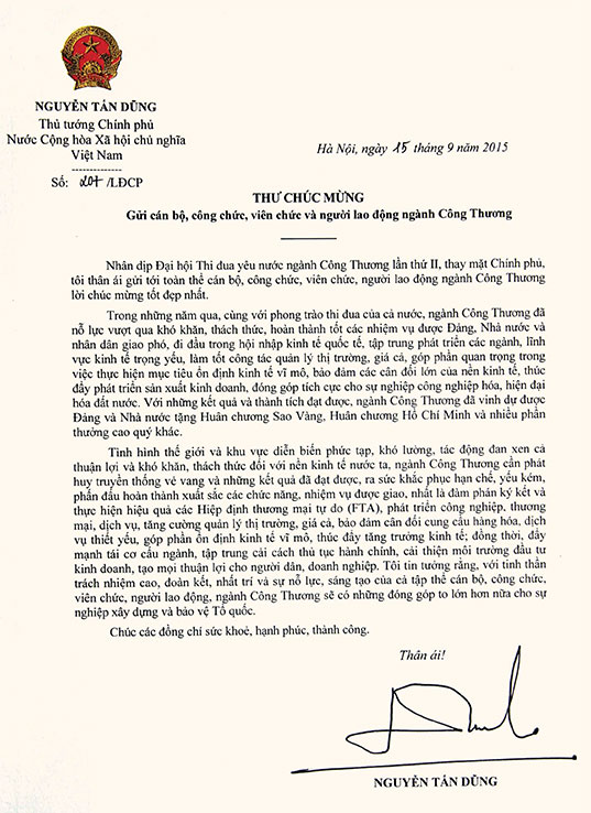 Thư chúc mừng của Thủ tướng Chính phủ Nguyễn Tấn Dũng nhân dịp Đại hội thi đua yêu nước ngành Công Thương lần thứ II