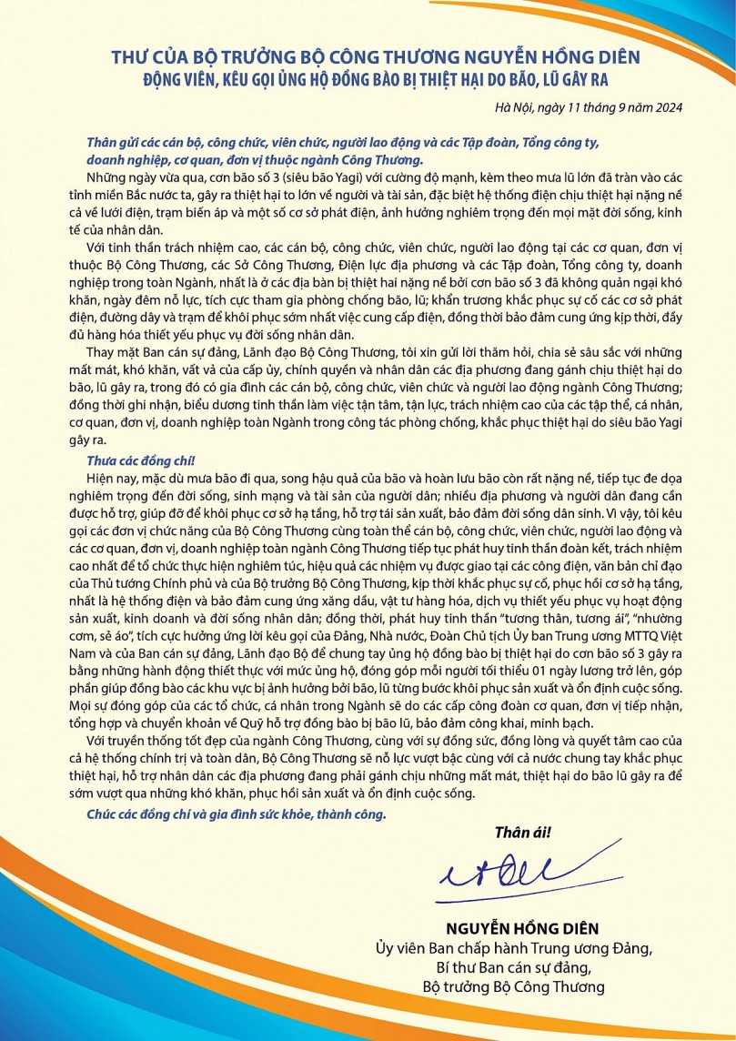 Những ngày vừa qua, cơn bão số 3 (siêu bão Yagi) với cường độ mạnh, kèm theo mưa lũ lớn đã tràn vào các tỉnh miền Bắc nước ta, gây ra thiệt hại to lớn về người và tài sản, đặc biệt hệ thống điện chịu thiệt hại nặng nề cả về lưới điện, trạm biến áp và một số cơ sở phát điện, ảnh hưởng nghiêm trọng đến mọi mặt đời sống, kinh tế của nhân dân. Thay mặt Ban Cán sự Đảng, Lãnh đạo Bộ Công Thương, Bộ trưởng Bộ Công Thương Nguyễn Hồng Diên đã có thư động viên, kêu gọi ủng hộ đồng bào bị thiệt hại do bão, lũ gây ra.