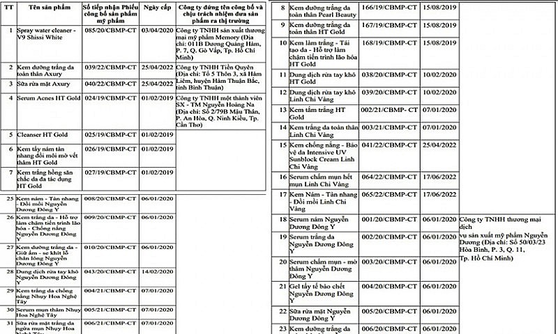 33 sản phẩm mỹ phẩm bị thu hồi, đình chỉ lưu hành, gồm: kem dướng Water cleaner V9 shiss9 White; kem dưỡng trắng da toàn thân, sữa rửa mặt Axury; kem tẩy nám tàn nhang đồi mồi mờ vết thâm, kem trắng hồng săn chắc da đa tác dụng HT Gold; kem nám- tàn nhang- đồi mồi, kem trắng da hỗn hợp làm chậm tiến trình lão hoá- chống nắng, kém dưỡng trắng da se khít lỗ chân lông của Nguyễn Dương Đông Y; dung dịch rửa tay; kem chống nắng, sữa rửa mặt, serum mụn thâm nhuỵ hoa Nghệ tây… mang nhãn hiệu HT Gold. Tất cả sản phẩm do Công ty TNHH một thành viên Sản xuất - Thương mại Nguyễn Hoàng Na sản xuất.