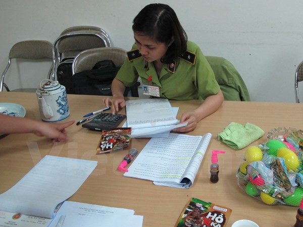 Lực lượng Quản lý thị trường Hà Nội đang lập biên bản thu giữ số bánh kẹo nhập lậu.