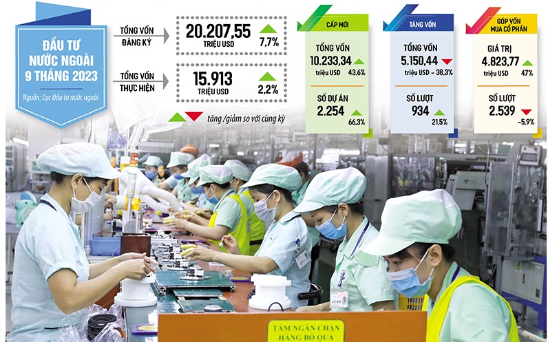 | Bức tranh thu hút đầu tư nước ngoài năm 2023 thêm sáng màu khi vốn nước ngoài đăng ký vào Việt Nam tiếp tục tăng. Trong ảnh: Dây chuyền lắp ráp linh kiện điện tử của Công ty Foster tại Bắc Ninh. Ảnh: Đức Thanh. Đồ họa: Đan Nguyễn |