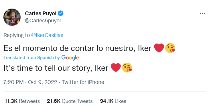 Chưa dừng lại ở đó, cựu danh thủ bóng đá Tây Ban Nha và Barcelona là Carles Puyol cũng lên tiếng ủng hộ Iker Casillas khi dẫn lại trạng thái với lời nói: "Đã đến lúc kể cho mọi người câu chuyện của chúng ta rồi, Iker", kèm theo biểu tượng trái tim và nụ hôn.