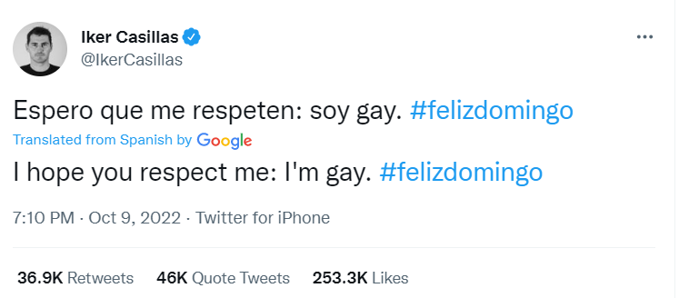 Vào 19 giờ 10 phút ngày 9/10 (giờ Việt Nam), thủ môn Iker Casillas - huyền thoại Real Madrid bất ngờ tuyên bố trên mạng xã hội Twitter: "Tôi là người đồng tính"