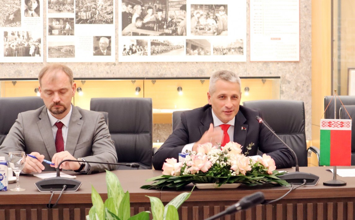 | Đại sứ Đặc mệnh toàn quyền Cộng hòa Belarus tại Việt Nam (bên phải ảnh) phát biểu tại buổi làm việc |