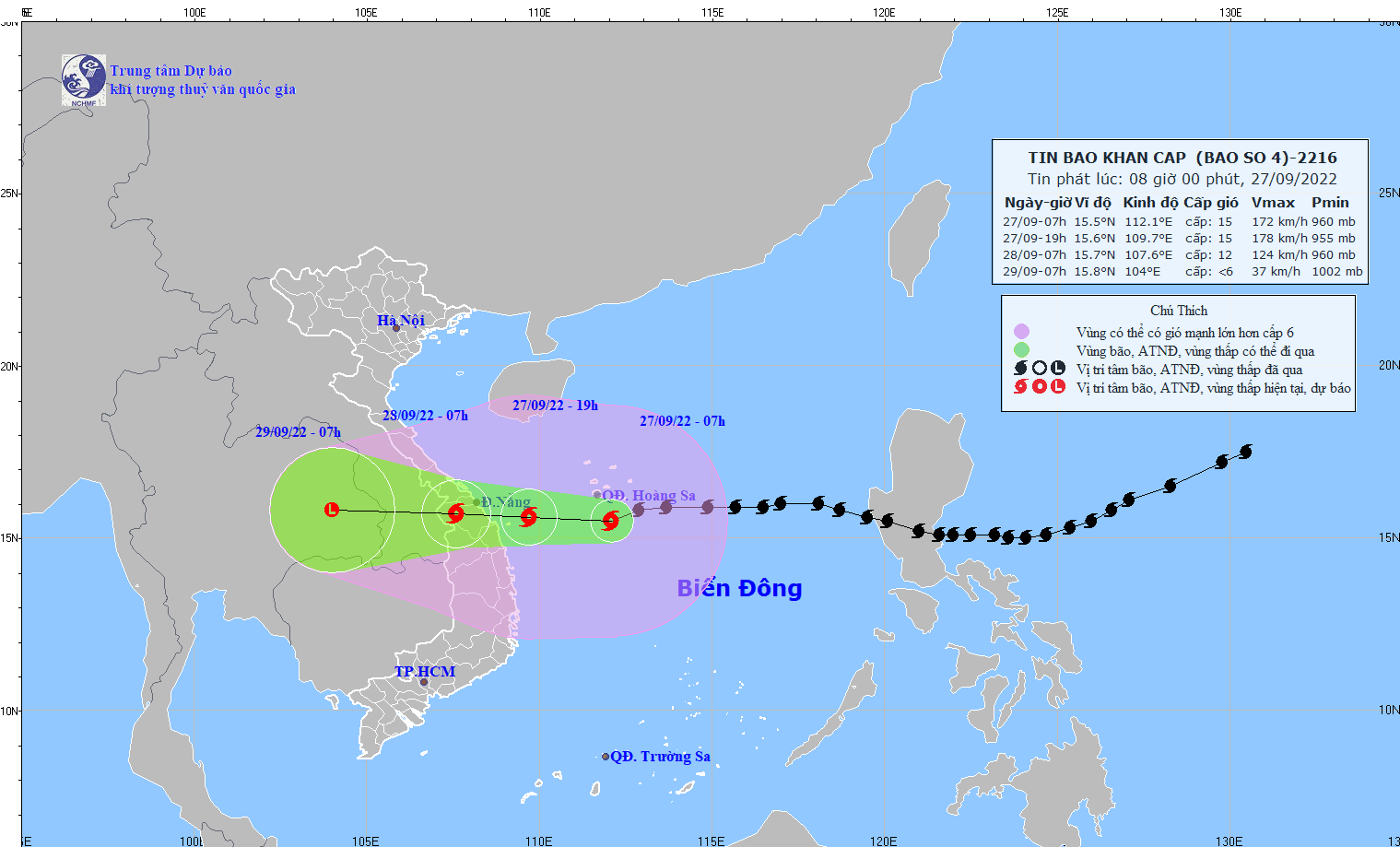 Theo Trung tâm Dự báo Khí tượng thủy văn Quốc gia, hồi 07 giờ ngày 27/9, vị trí tâm bão số 4 ở khoảng 15,5 độ Vĩ Bắc; 112,1 độ Kinh Đông, trên vùng biển phía Nam quần đảo Hoàng Sa, cách đất liền khu vực Đà Nẵng-Quảng Ngãi khoảng 360km về phía Đông. Sức gió mạnh nhất vùng gần tâm bão mạnh cấp 14-15 (150-183km/giờ), giật trên cấp 17. Bán kính gió mạnh từ cấp 6, giật từ cấp 8 trở lên khoảng 300km tính từ tâm bão; bán kính gió mạnh từ cấp 10, giật từ cấp 12 trở lên khoảng 150km tính từ tâm bão.
