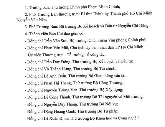 Theo Quyết định này, Thủ tướng Chính phủ Phạm Minh Chính làm Trưởng ban Ban Chỉ đạo; Bí thư Thành ủy TP. Hồ Chí Minh Nguyễn Văn Nên làm Phó Trưởng Ban Thường trực Ban Chỉ đạo; Bộ trưởng Bộ kế hoạch và Đầu tư Nguyễn Chí Dũng làm Phó Trưởng ban. Thành viên Ban Chỉ đạo là 12 đại diện lãnh đạo đại diện lãnh đạo các bộ, cơ quan ngang bộ.