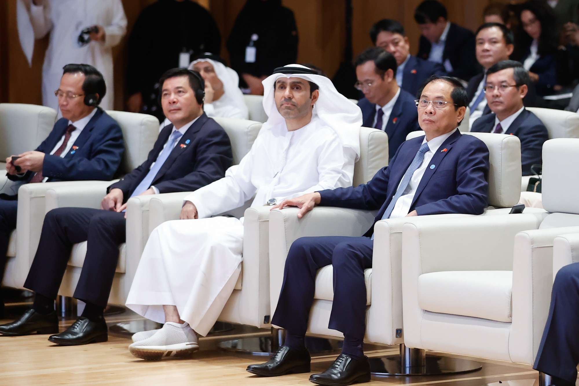 | Phó Thủ tướng, Bộ trưởng Bộ Ngoại giao Bùi Thanh Sơn cùng Bộ trưởng Bộ Công Thương Nguyễn Hồng Diên và các đại biểu hai nước Việt Nam - UAE tham dự sự kiện. Ảnh: VGP/Nhật Bắc |