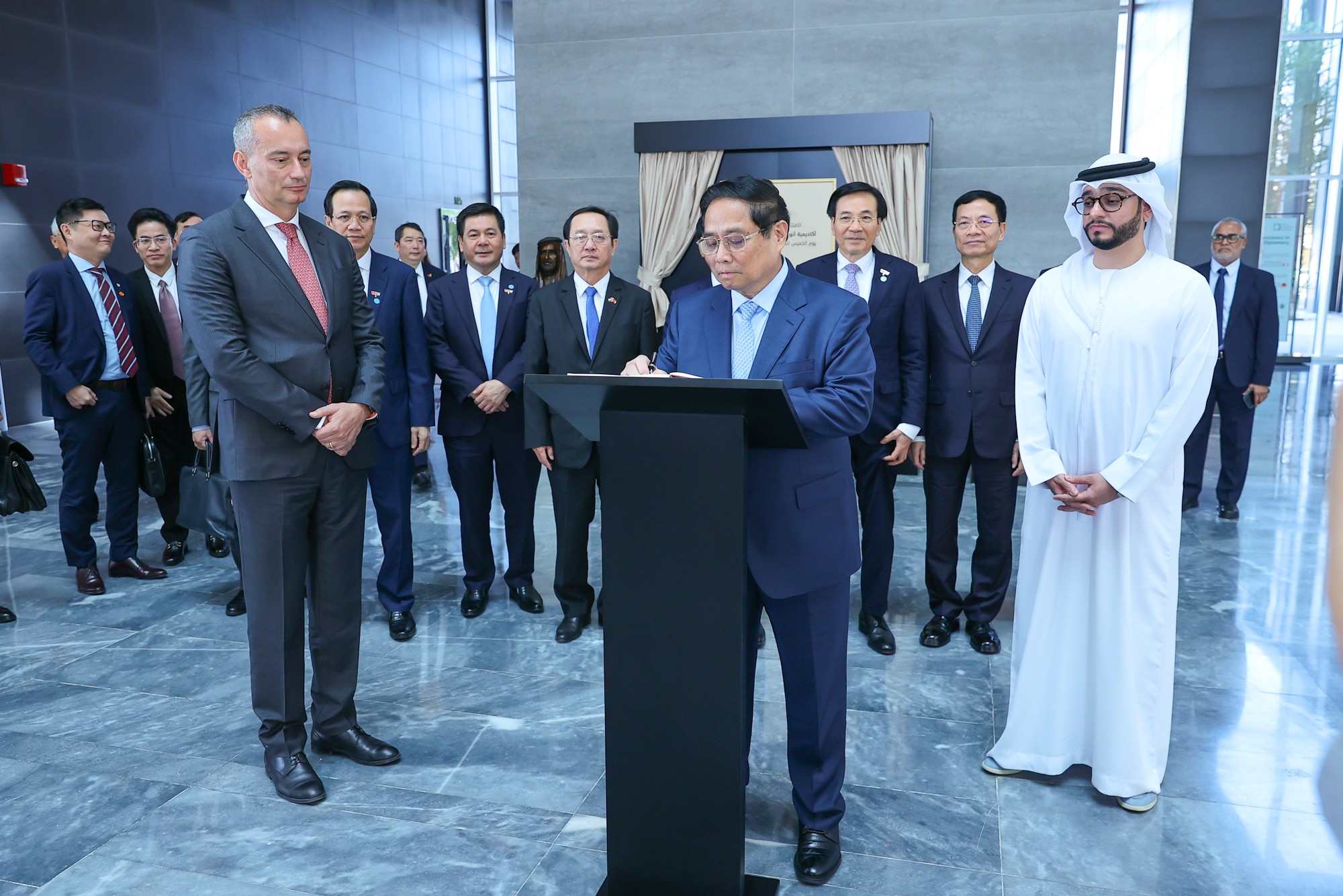 | Thủ tướng ghi sổ lưu niệm tại Học viện Ngoại giao Anwar Gargash - Ảnh: VGP/Nhật Bắc |