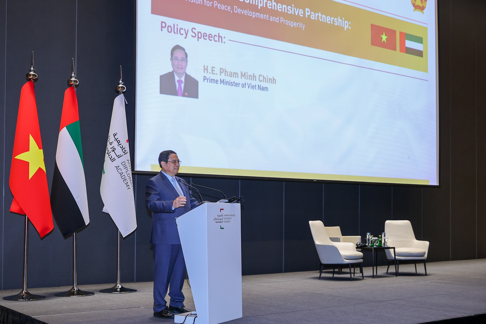 Sáng 29/10, tại Abu Dhabi, trong chương trình thăm chính thức UAE, Thủ tướng Phạm Minh Chính đã có bài phát biểu chính sách quan trọng tại Học viện Ngoại giao Anwar Gargash với chủ đề “Quan hệ Đối tác toàn diện Việt Nam-UAE: Tầm nhìn chung về hòa bình, phát triển và thịnh vượng”.