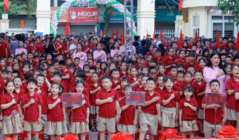 | Các em học sinh Trường Nguyễn Đình Chiểu hát vang Quốc ca tại Lễ khai giảng - Ảnh: VGP/Nhật Bắc |