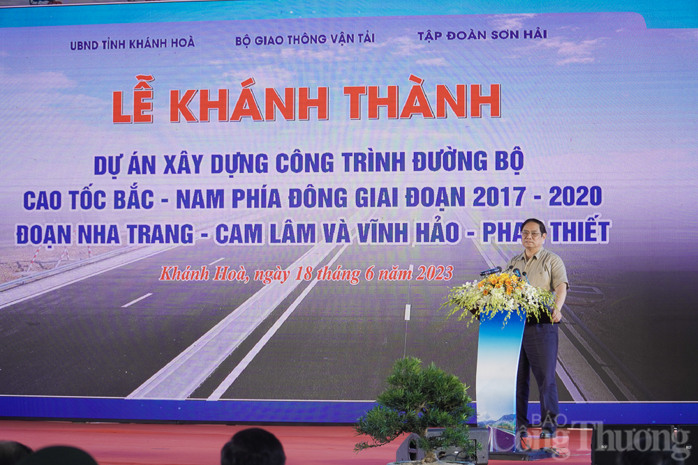 Chiều 18/6, tại tỉnh Khánh Hoà, Thủ tướng Phạm Minh Chính, Trưởng Ban Chỉ đạo Nhà nước các công trình, dự án quan trọng quốc gia, trọng điểm ngành giao thông vận tải dự Lễ Khánh thành Dự án đầu tư xây dựng công trình đường bộ cao tốc Bắc - Nam phía Đông giai đoạn 2017 - 2020 các đoạn Nha Trang - Cam Lâm và Vĩnh Hảo - Phan Thiết.