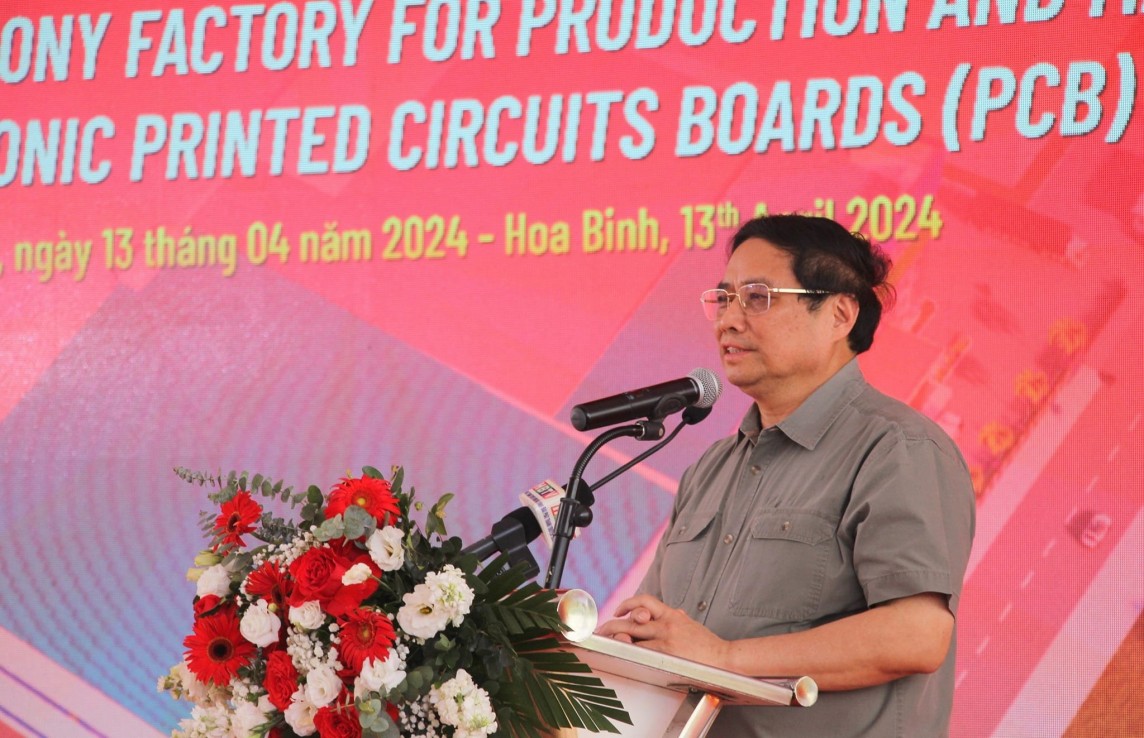 | Thủ tướng Chính phủ Phạm Minh Chính phát biểu tại lễ khởi công dự án Nhà máy sản xuất, chế tạo các loại bảng mạch in điện tử do Tập đoàn Meiko Nhật Bản đầu tư tại tỉnh Hòa Bình (Ảnh: Hồng Trung) |