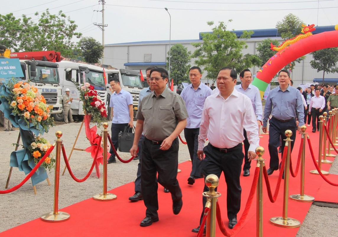 | Thủ tướng Chính phủ Phạm Minh Chính cùng lãnh đạo các ban, bộ, ngành Trung ương; lãnh đạo tỉnh Hòa Bình và Tập đoàn Meiko bấm nút khởi công dự án (Ảnh: Hồng Trung) |