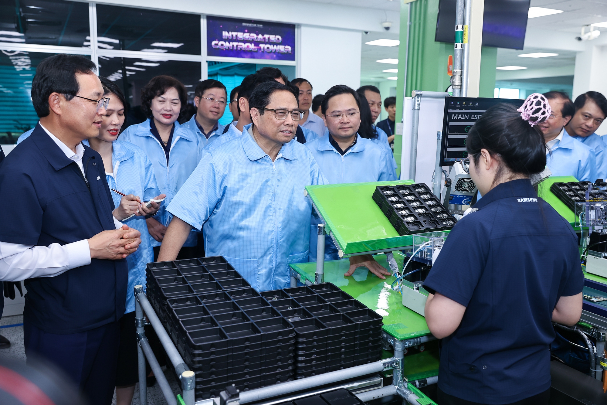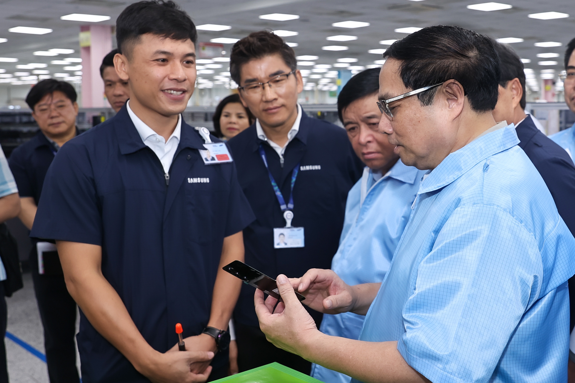 | Thủ tướng Phạm Minh Chính tham quan dây chuyền sản xuất thiết bị điện tử của Công ty, trao đổi với các nhân viên Samsung về tình hình sản xuất - Ảnh: VGP/Nhật Bắc |