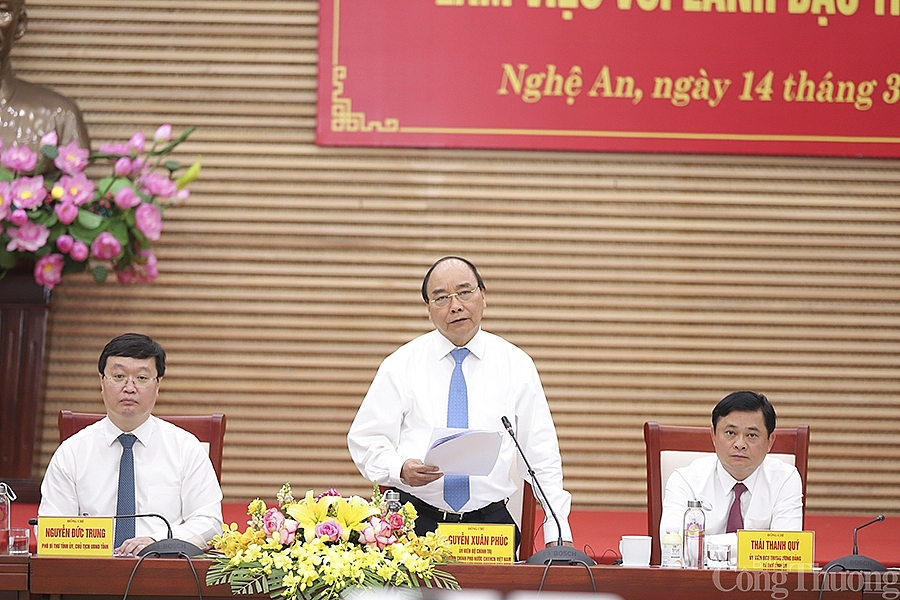 | Thủ tướng Nguyễn Xuân Phúc lưu ý Nghệ An cần chuyển từ phát triển theo chiều rộng sang chiều sâu, có tầm nhìn dài hạn hơn và tập trung phát triển miền Tây Nghệ An theo hướng xanh hóa |