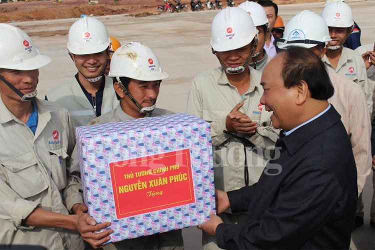 | Thủ tướng thị sát Khu dịch vụ, du lịch phức hợp cao cấp có casino tại Vân Đồn và tặng quà động viên công nhân đang thi công trên công trường |