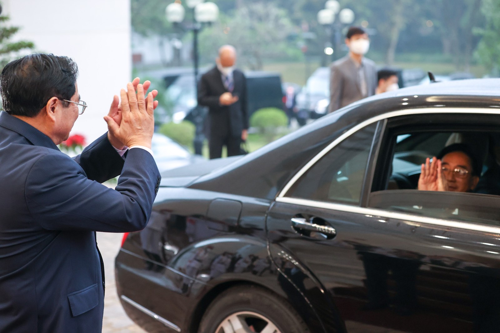 Thủ tướng Phạm Minh Chính tiễn Thủ tướng Lào Phankham Viphavanh rời trụ sở Chính phủ