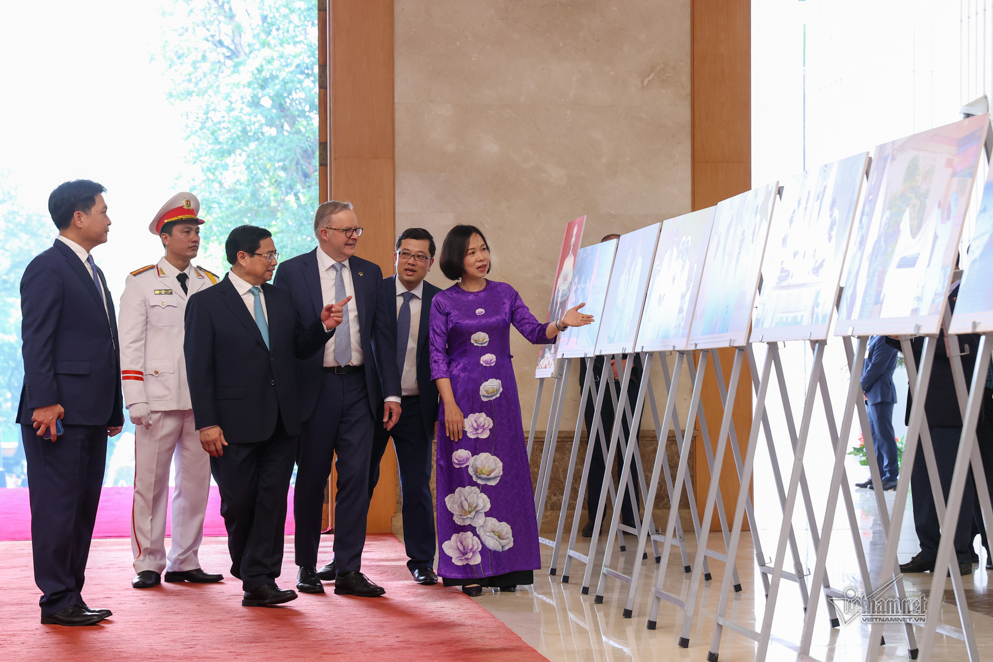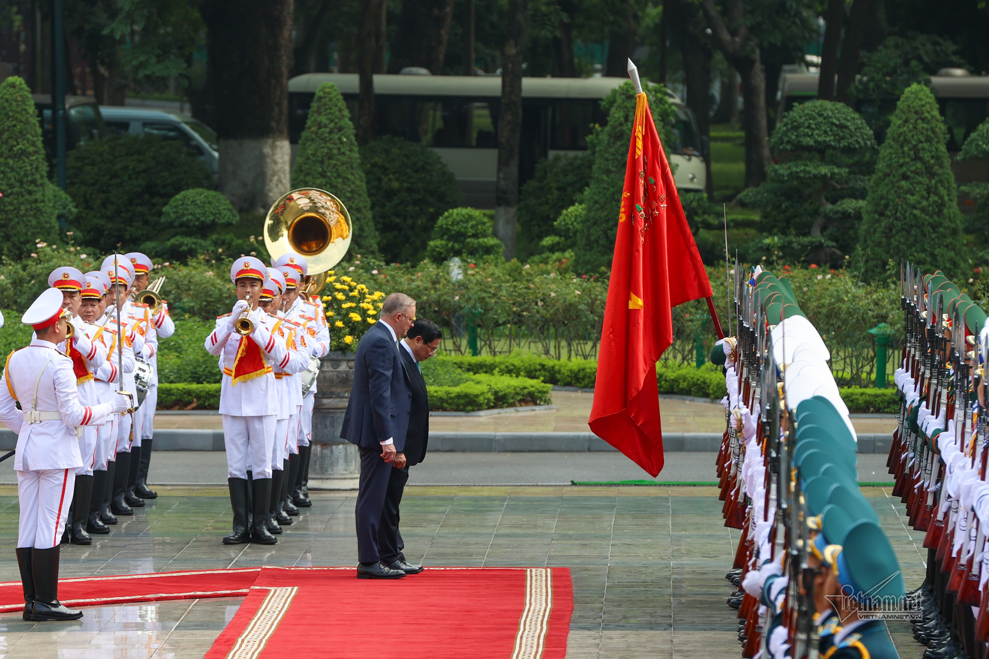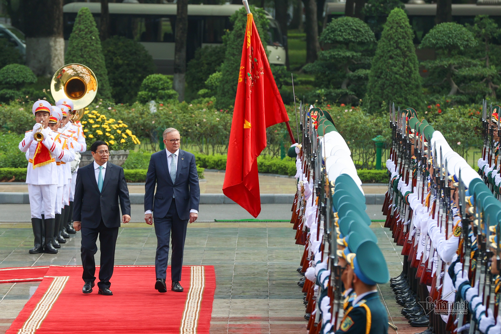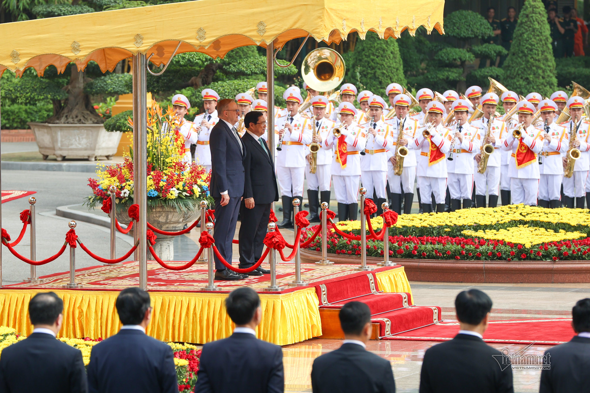 Sau cái ôm, bắt tay nồng ấm giữa hai Thủ tướng, các em học sinh gửi tới Thủ tướng Anthony Albanese bó hoa tươi thắm. Thủ tướng Phạm Minh Chính mời Thủ tướng Australia bước trên thảm đỏ và tới bục danh dự.Quốc thiều hai nước cử lên, hai nhà lãnh đạo cùng bước tới chào Quốc kỳ hai nước. Hai Thủ tướng duyệt Đội Danh dự Quân đội nhân dân Việt Nam.
