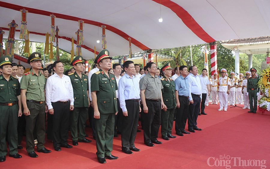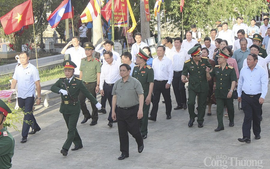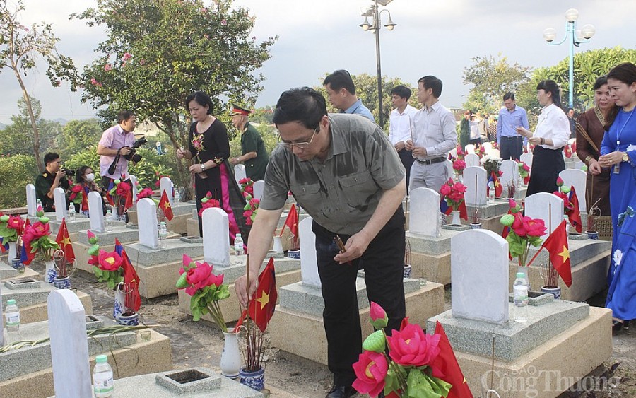 Chiều tối ngày 23/7, Thủ tướng Phạm Minh Chính đã tới dâng hương, dâng hoa tưởng niệm các anh hùng, liệt sĩ tại Nghĩa trang liệt sĩ quốc tế Việt - Lào và dự chương trình nghệ thuật "Bản hùng ca bất diệt" nhân dịp kỷ niệm 75 năm Ngày thương binh, liệt sĩ tại huyện Anh Sơn, Nghệ An.