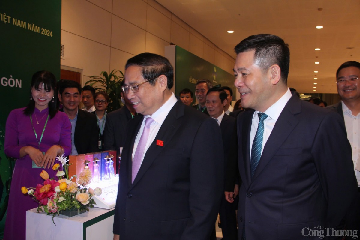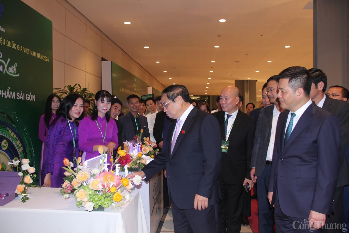 | Thủ tướng Phạm Minh Chính cùng Bộ trưởng Bộ Công Thương Nguyễn Hồng Diên tham quan các gian hàng của các doanh nghiệp đạt Thương hiệu quốc gia Việt Nam 2024. Ảnh: Phương Cúc |