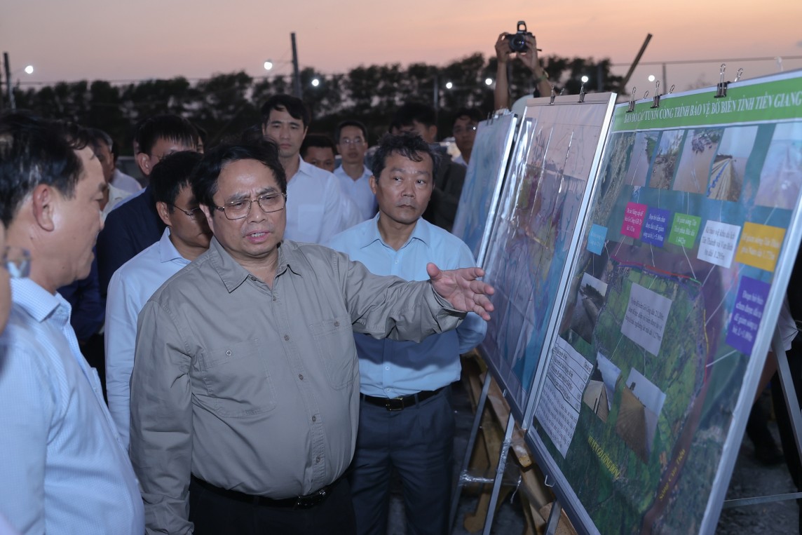 Trong chương trình công tác tại Tiền Giang, chiều tối 23/3, Thủ tướng Phạm Minh Chính đã đến khảo sát, kiểm tra tiến độ một số dự án trọng điểm trên địa bàn tỉnh Tiền Giang gồm cầu Rạch Miễu 2, tuyến đê biển Gò Công, quy hoạch xây dựng cảng biển và khu phục hồi diện tích biển Gò Công.