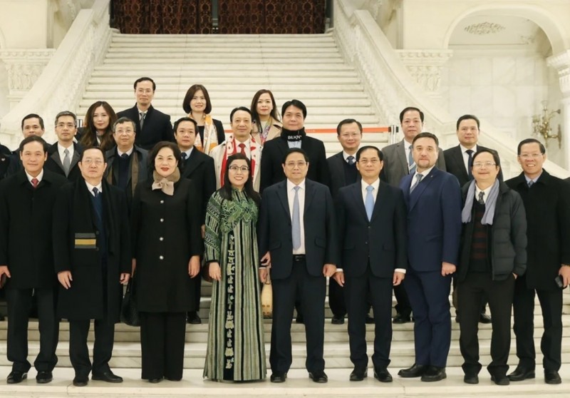 | Thủ tướng Phạm Minh Chính và Phu nhân cùng các đại biểu chụp ảnh lưu niệm tại Nhà Quốc hội ở thủ đô Bucharest. Ảnh: Dương Giang/TTXVN |