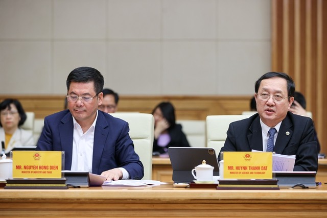 Bộ trưởng Bộ Công Thương Nguyễn Hồng Diên cùng Bộ trưởng Bộ Khoa học và Công nghệ Huỳnh Thành Đạt tại buổi tiếp - Ảnh: VGP/Nhật Bắc