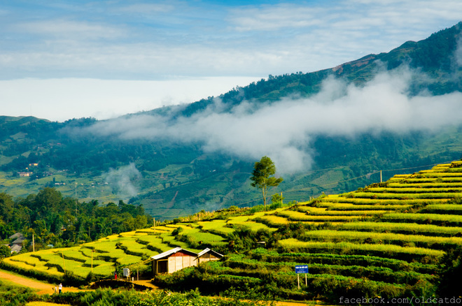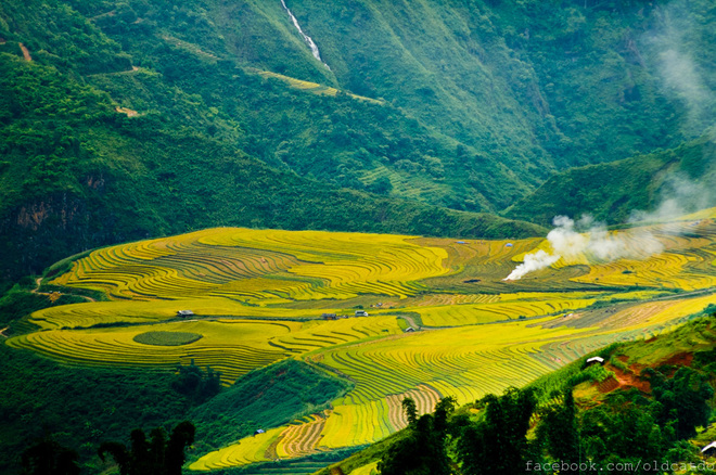 Những làn mây nhẹ buổi sớm lan trên ruộng bậc thang vàng óng.