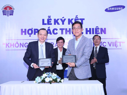 Ông Bùi Xuân Đức - Giám đốc Thư viên khoa học tổng hợp TP.Hồ Chí Minh (trái) và ông Kim Cheol Gi – Tổng giám đốc Công ty Điện tử Samsung Vina ký kết biên bản hợp tác