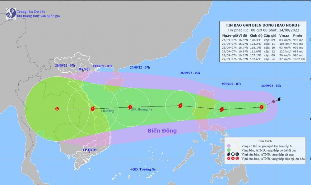 Ngày 24/9, Ban Chỉ huy Phòng chống thiên tai và tìm kiếm cứu nạn (PCTT và TKCN) Thừa Thiên Huế cho biết, hồi 07 giờ ngày 24/9, vị trí tâm bão Noru ở khoảng 16,5 độ Vĩ Bắc; 128,3 độ Kinh Đông, cách đảo Lu-Dông (Philippin) khoảng 710km về phía Đông.