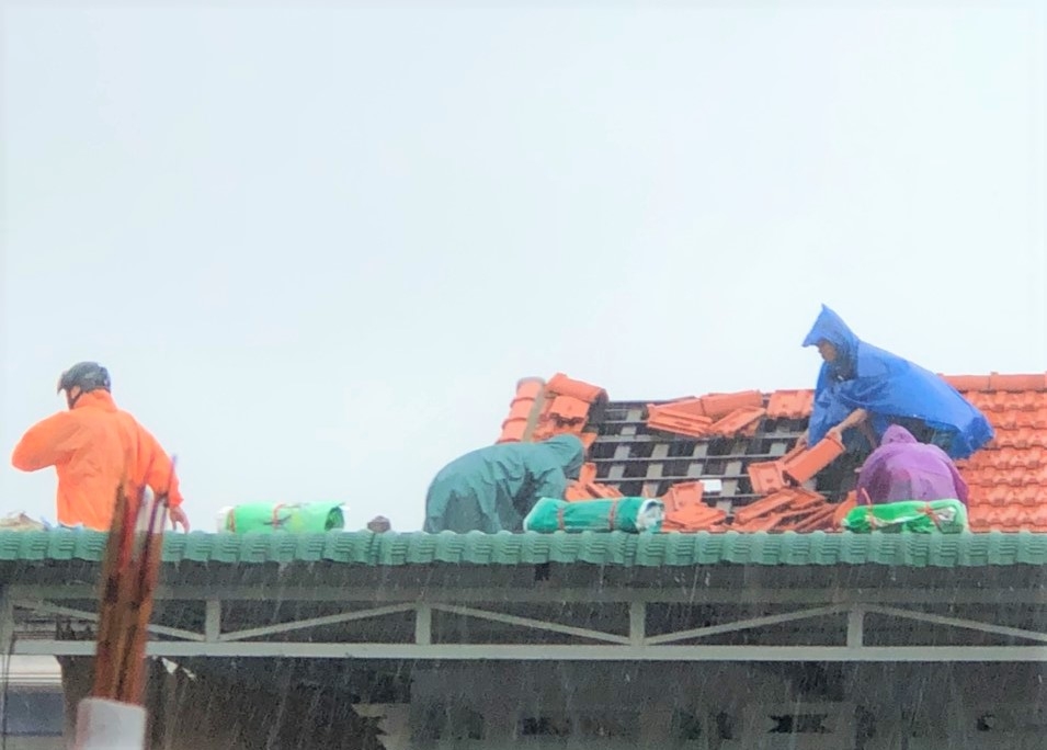| Lực lượng xung kích địa phương cùng người dân sửa lại nhà cửa |