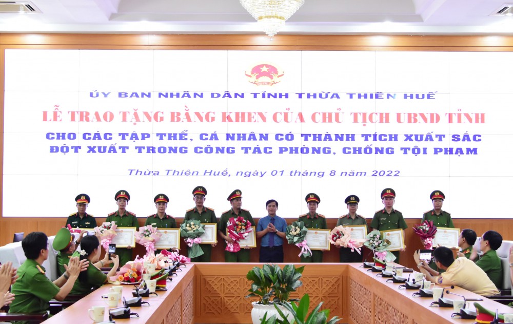 Ngày 1/8, UBND tỉnh Thừa Thiên Huế tổ chức Lễ trao tặng Bằng khen của Chủ tịch UBND tỉnh cho các tập thể, cá nhân có thành tích xuất sắc đột xuất trong công tác phòng, chống tội phạm liên quan đến vụ án dùng súng cướp tiệm vàng tại khu vực chợ Đông Ba diễn ra vào trưa ngày 31/7.