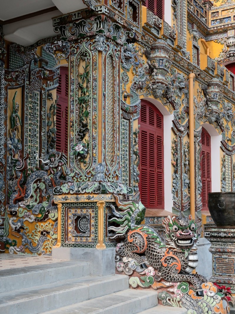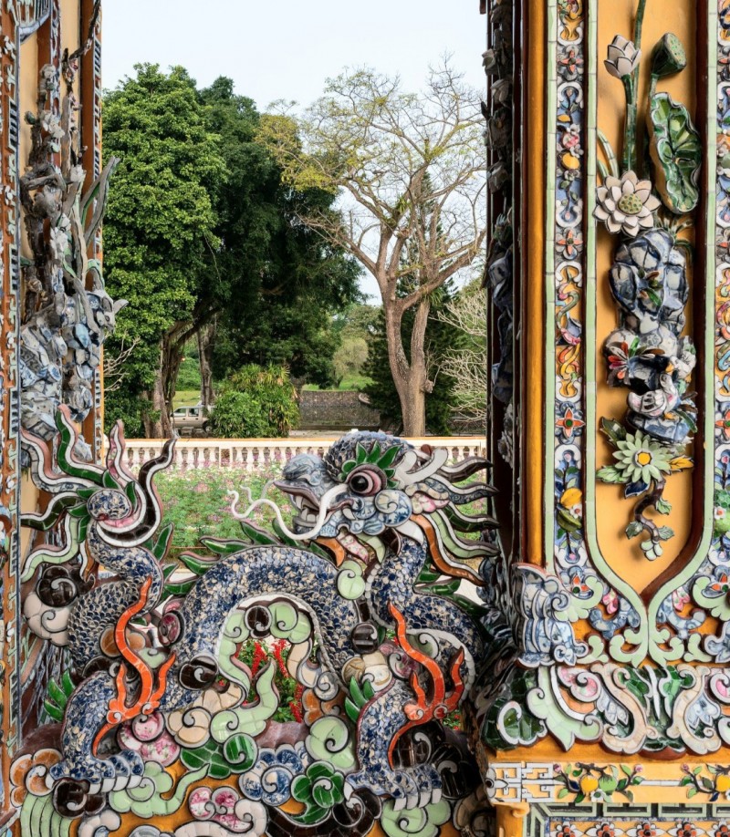 Tượng rồng được khảm sành sứ trên mái, xung quanh cung điện với hoạ tiết rồng 5 móng biểu trưng quyền lực của vương triều Nguyễn