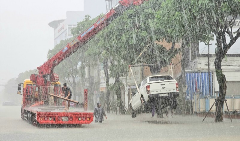 Mưa lớn, nước lên nhanh, nhiều xe ô tô không kịp di chuyển nên phải gọi lực lượng cứu hộ