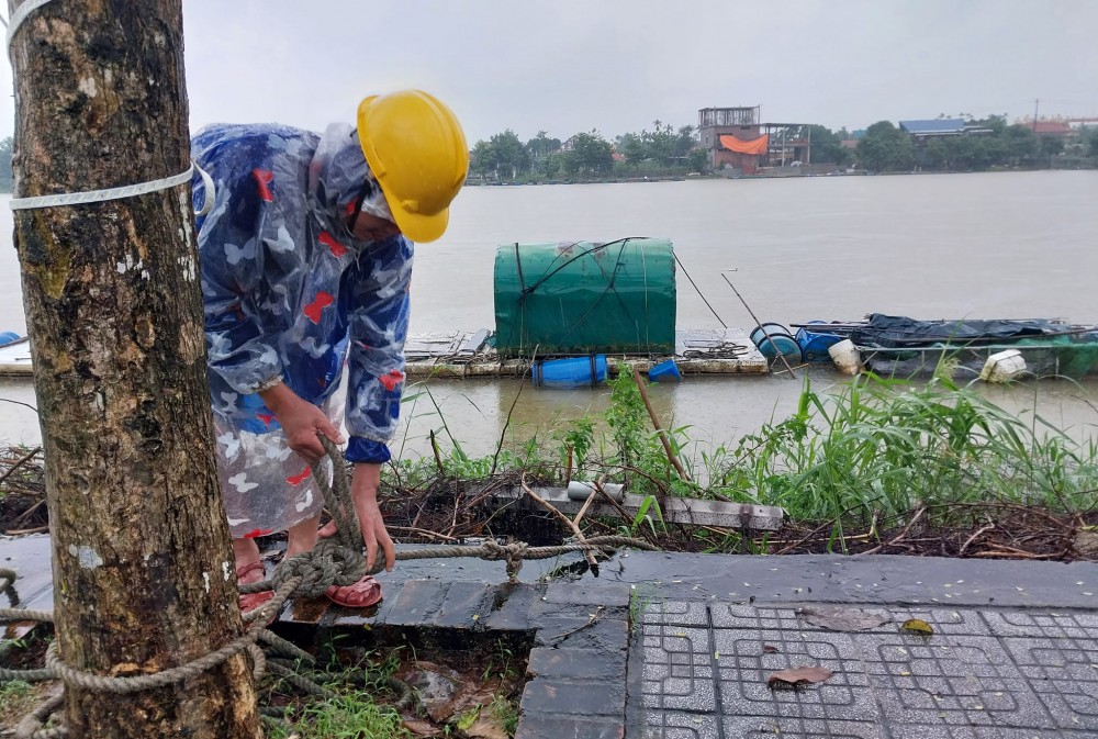 | Người dân khu vực vùng thấp trũng huyện Quảng Điền tiến hành cột néo lồng bè nuôi cá |