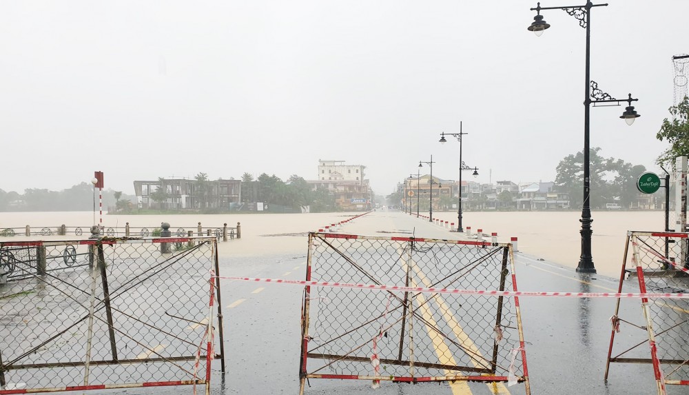 | Theo ghi nhận của phóng viên, từ trưa chiều ngày 14/10 nước lũ tràn qua Đập Đá, lực lượng chức năng đã cấm đường từ tuyến đường Lê Lợi nối Nguyễn Sinh Cung. |