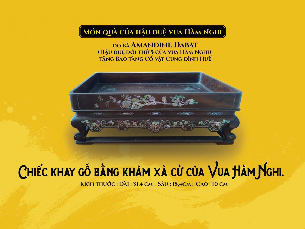 Các kỷ vật gồm khay trà, tẩu thuốc và bộ sách chữ Hán của vua Hàm Nghi được Tiến sĩ Amandine Dabat - hậu duệ đời thứ năm của vua Hàm Nghi giao cho Đại sứ quán Việt Nam tại Paris (Pháp) cùng đại diện Bảo tàng Mỹ thuật Việt Nam mang về trao tặng cho Trung tâm BTDTCĐ Huế (Thừa Thiên Huế) và UBND huyện Cam Lộ (tỉnh Quảng Trị).
