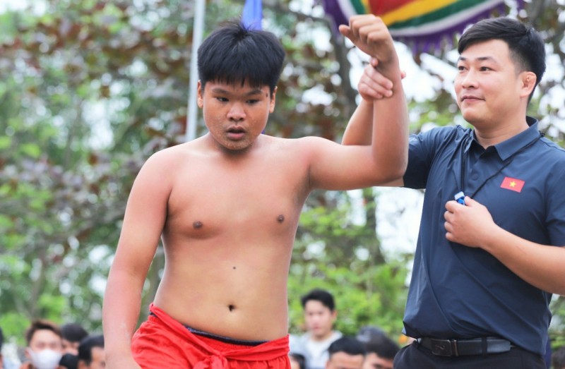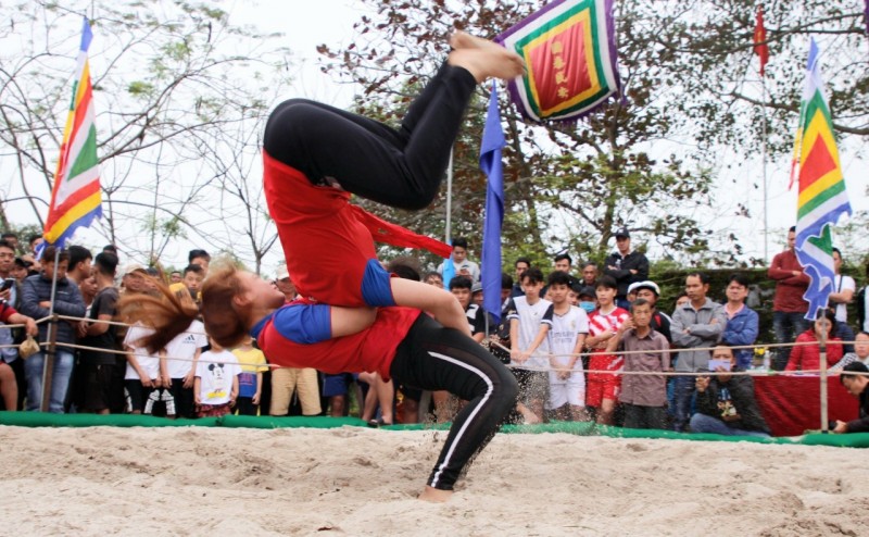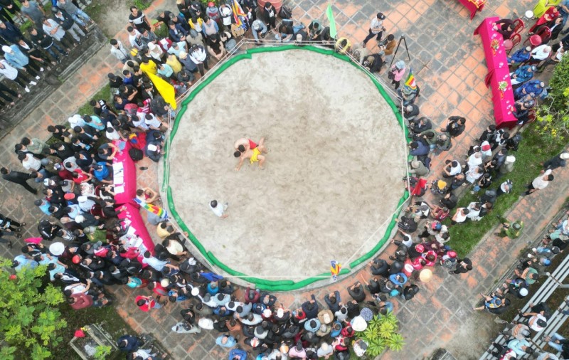 | Hàng trăm khán giả dõi theo và reo hò cổ vũ khắp sân đình mỗi khi có một đô vật bị vật ngã; những tình huống gay cấn, kỹ thuật vật đẹp mắt. |