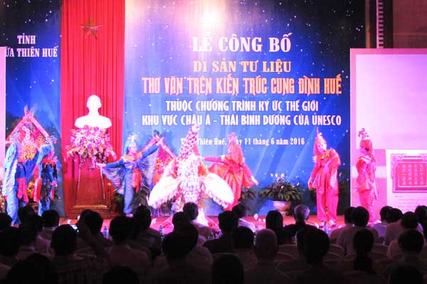 Trước đó, di sản tư liệu Thơ văn trên kiến trúc cung đình Huế được ghi danh vào Chương trình Ký ức thế giới khu vực châu Á-Thái Bình Dương và được công bố tại Hội nghị toàn thể lần thứ 7 của Ủy ban Chương trình ký ức thế giới khu vực châu Á-Thái Bình Dương (gọi tắt là MOWCAP) tại thành phố Huế vào tháng 5 vừa qua.