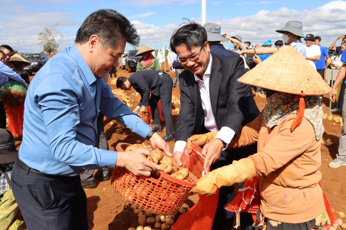 Tại hội thảo, ngoài việc được chia sẻ kinh nghiệm hợp tác thành công trong việc kết nối các đối tác trong chuỗi giá trị sản xuất khoai tây bền vững, giảm phát thải, các đại biểu còn được tham quan mô hình liên kết sản xuất khoai tây bền vững để tìm hiểu các giải pháp về giống; giải pháp canh tác/phân bón; giải pháp quản lý sâu bệnh cũng như các giải pháp về công nghệ drone, tưới, SFI… và tham gia thu hoạch khoai tây chất lượng quốc tế cùng với hàng trăm nông dân tham gia mô hình.