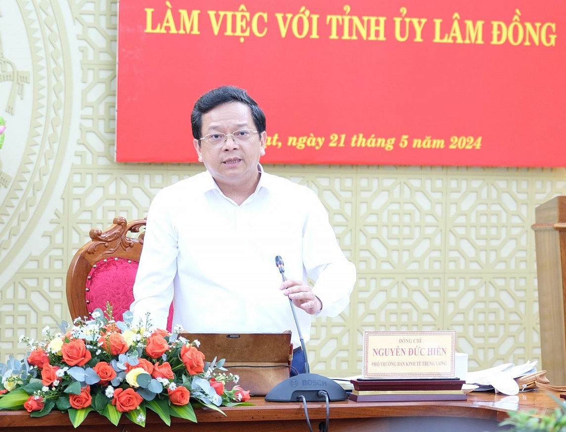 | Đồng chí Nguyễn Đức Hiển - Phó Trưởng Ban Kinh tế Trung ương phát biểu tại buổi làm việc với Tỉnh uỷ Lâm Đồng ngày 21/5/2024 (Ảnh: Báo Lâm Đồng) |